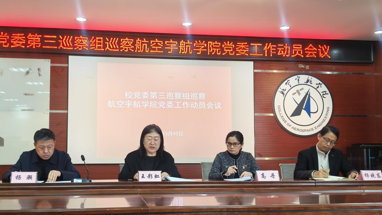 校党委第三巡察组巡察航空宇航学院党委工作动员会召开根据校党委关于巡察工作的统一部署,2026年3月10日,召开校党委第三巡察组巡察航空宇航学院党委工作动员会。会上,第三巡察组组长王彩虹作了动员讲话,对做好巡察工作提出要求。航空宇航学院党委书记杨灏作了表态发言,会议由杨灏主持。校党委第三巡察组组长、副组长及巡察组成员,航空宇航学院领导班子成员出席会议,学院全体教职工列席会议。 王彩虹强调,校内巡察是加强...
