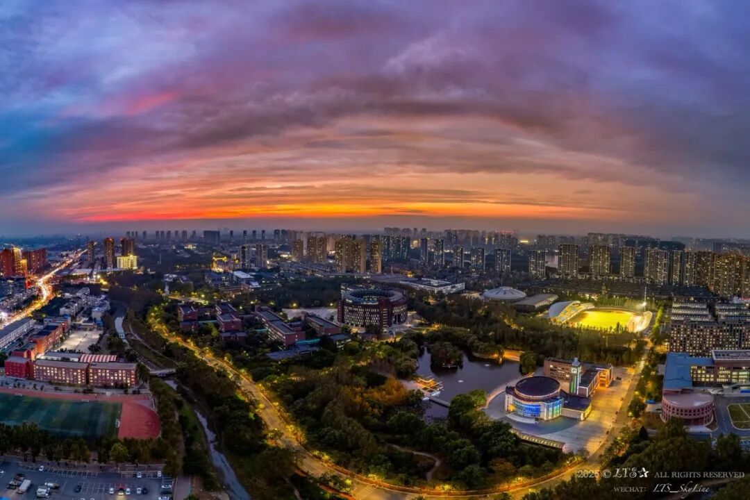 橙紫渐变的晚霞铺满天,红砖教学楼在暮色中温柔静立,体育场的灯光如金色海洋般亮起。那一刻,科技与自然在镜头里相遇——原来,我们每天穿行的校园,从空中看,这么美。