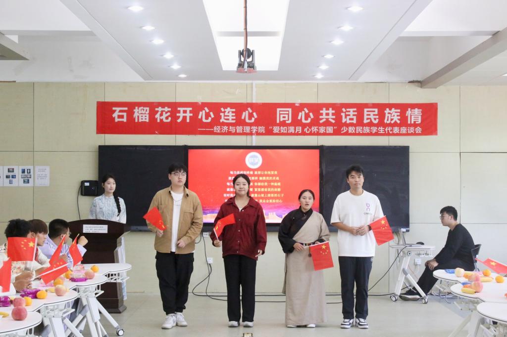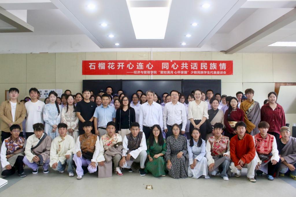 秋韵袅袅,家国同庆。在国庆中秋即将到来之际,9月29日下午1时,“石榴花开心连心 同心共话民族情”——“爱如满月 心怀家国”经济与管理学院少数民族学生座谈交流会于经管楼418召开。经济与管理学院院长荆浩、党委书记高丹、副院长李作学、党委副书记田晓光出席本次活动,活动由2024级新疆籍少数民族学生代表郝梓轩主持。