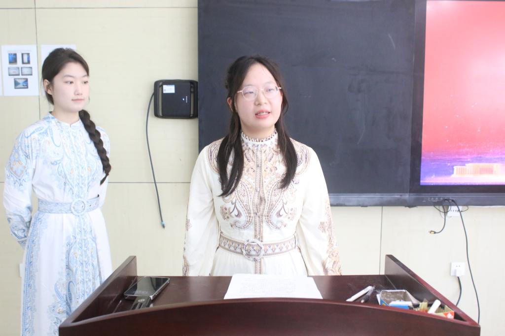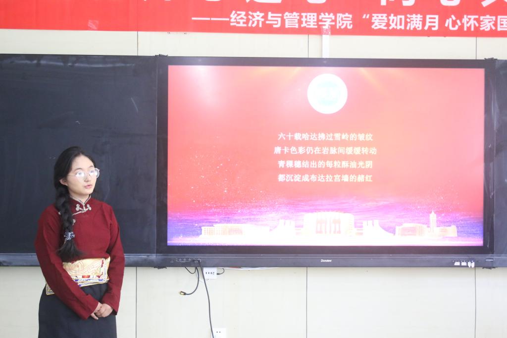 座谈会第一部分以习近平总书记率中央代表团抵达拉萨出席西藏自治区成立60周年庆祝活动、新疆维吾尔自治区成立70周年习近平接见新疆各族各界代表以及纪念中国人民抗日战争暨世界反法西斯战争胜利80周年纪念大会精彩瞬间三段视频拉开序幕。随后,2023级金融学专业藏族学生白玛曲珍带来以“铭记历史 心怀家国”为主题的诗歌朗诵《旗帜与足迹》。